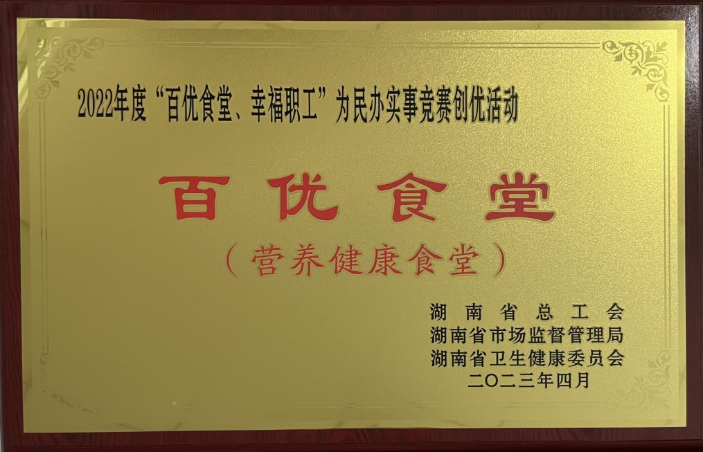 又訊,在湖南省2022年度“百優(yōu)食堂、幸福職工”為民辦實(shí)事競(jìng)賽創(chuàng)優(yōu)活動(dòng)中,公司四化大廈食堂榮獲湖南省“百優(yōu)食堂”稱號(hào)。