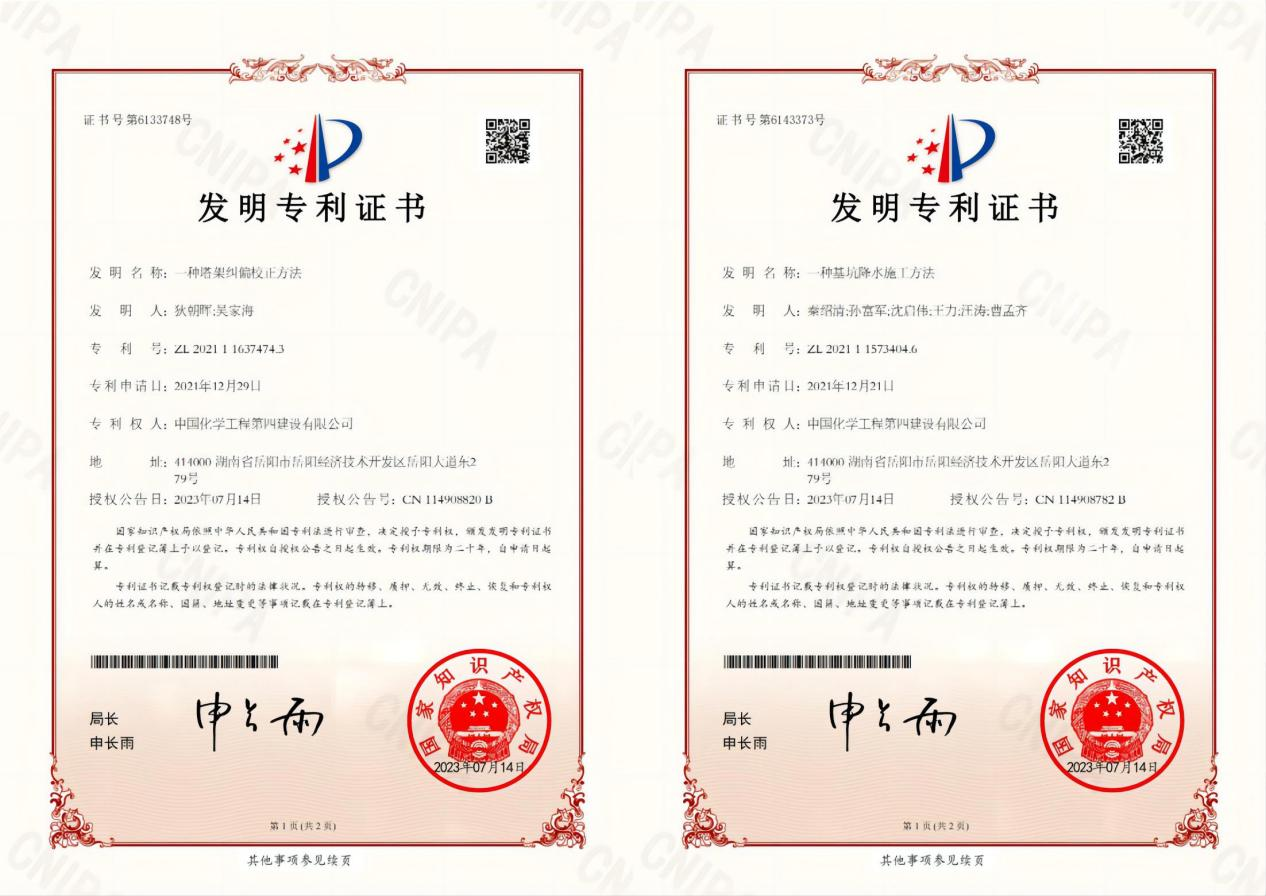 近日,從國家知識產(chǎn)權(quán)局傳來喜訊,公司新獲兩項(xiàng)發(fā)明專利。其中專利“一種塔架糾偏校正方法”,發(fā)明人為華東公司狄朝暉、吳家海,專利號ZL202111637474.3;專利“一種基坑降水施工方法”,發(fā)明人為華東公司秦紹清、孫富軍、沈啟偉、王力、汪濤、曹孟齊,專利號ZL202111573404.6。