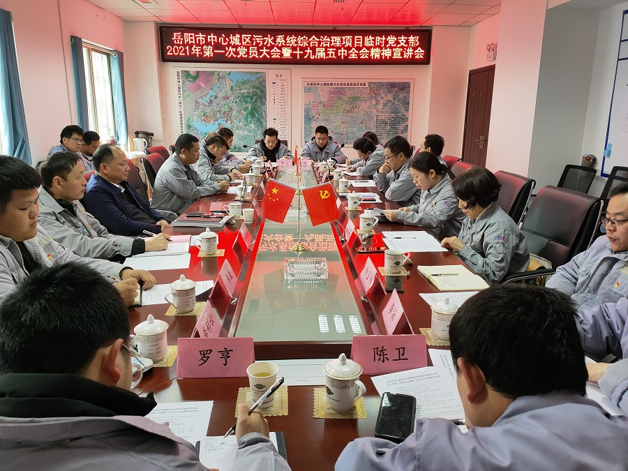 3月1日下午,岳陽市中心城區污水系統綜合治理項目臨時黨支部召開了2021年第一次黨員大會暨十九屆五中全會精神宣講會。公司宣講團副團長、黨委副書記、總經理周鴻作宣講報告。項目臨時黨支部書記陳誠主持會議。支部26名黨員、入黨積極分子參加了學習。