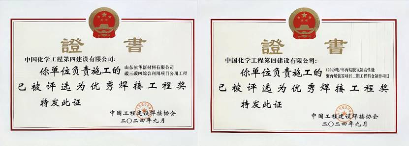 近日,從中國工程建設焊接協會傳來喜報,由公司申報的江西公司“山東濱華新材料有限公司碳三碳四綜合利用項目公用工程”和華北公司“120萬噸/年丙烷脫氫制高性能聚丙烯裝置項目二期工程料倉制作項目”分別榮獲2024年度優秀焊接工程獎。