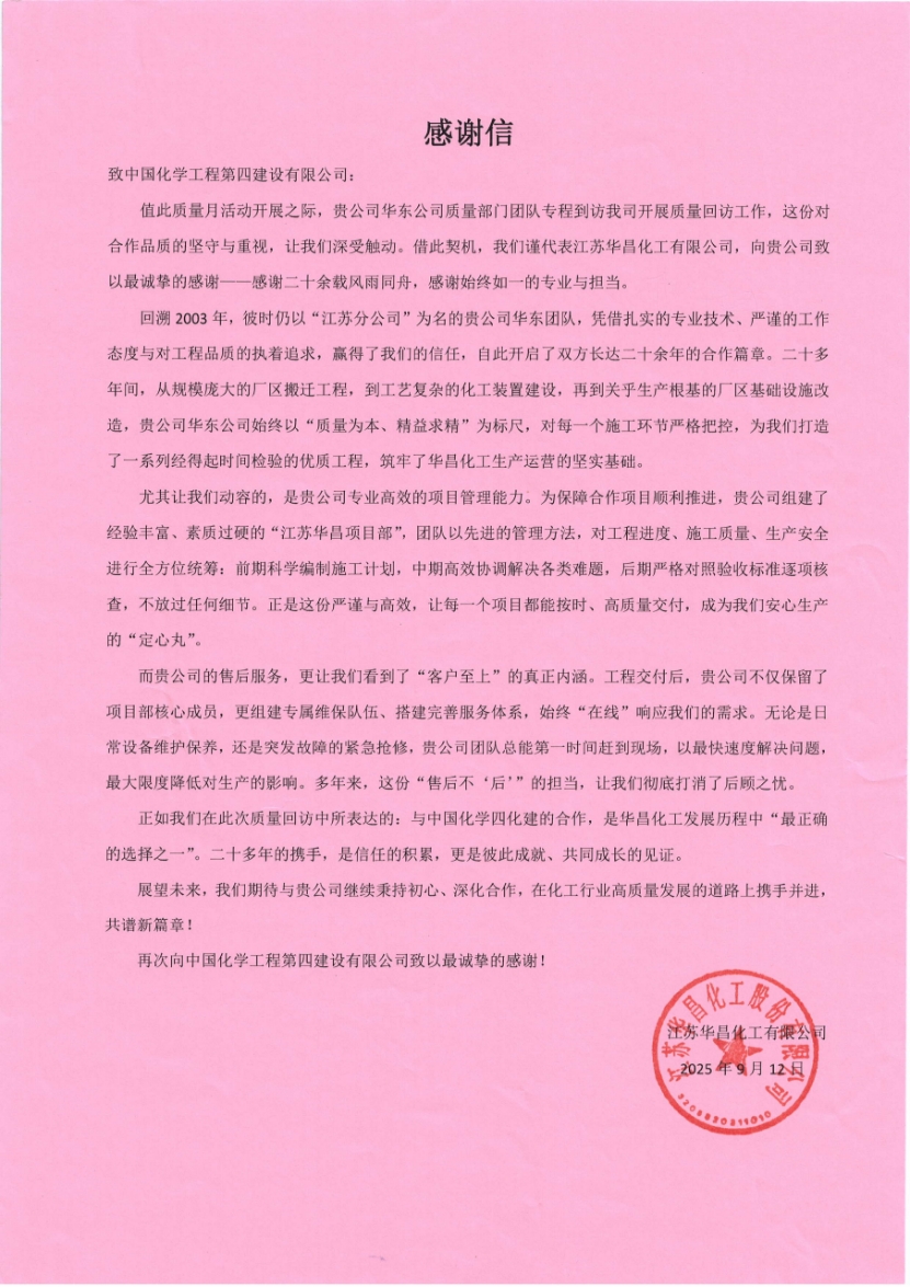 近日,在全國“質量月”活動開展之際,華東公司收到江蘇華昌化工有限公司發來的感謝信。這份滿載認可的信函,不僅是合作方對華東公司質量管理工作的高度肯定,更成為雙方20余載風雨同舟、攜手共進的深厚合作情誼的生動見證。