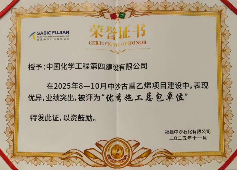 近日,在福建中沙古雷PC&BPA聯合裝置項目第七次高層會預備會暨項目推進會上,由中國化學工程四化建華南公司承建的該項目五標段安裝工程憑借過硬的施工履約能力、出色的項目精益管理水平,獲評業主單位“優秀施工總包單位”與總包單位“優秀質量管理先進集體”雙項榮譽,公司副總經理張日暉出席會議。