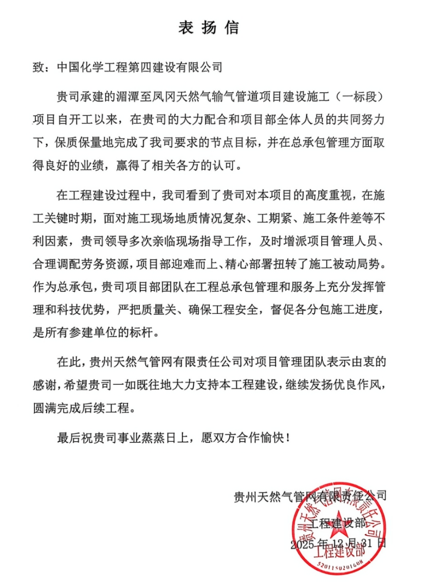 此次獲贈感謝信,既是對項目團隊辛勤付出的充分肯定,也是對華東公司專業履約能力的有力印證。華東公司將繼續秉持高標準、嚴要求,不斷提升項目管理與服務水平,努力打造更多令客戶滿意的精品工程,為公司加快建設世界一流工程公司作出應有貢獻。