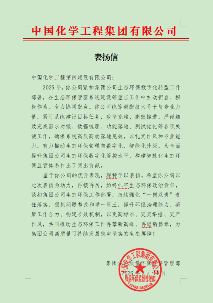 近日,中國化學(xué)工程第四建設(shè)有限公司收到中國化學(xué)工程集團(tuán)有限公司質(zhì)量環(huán)保監(jiān)督管理部發(fā)來的表揚(yáng)信,對公司在2025年度生態(tài)環(huán)保數(shù)字化轉(zhuǎn)型工作中的積極貢獻(xiàn)與推進(jìn)成效給予充分肯定。