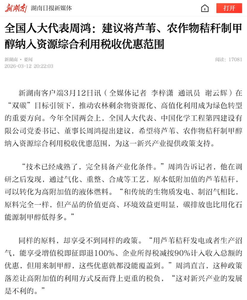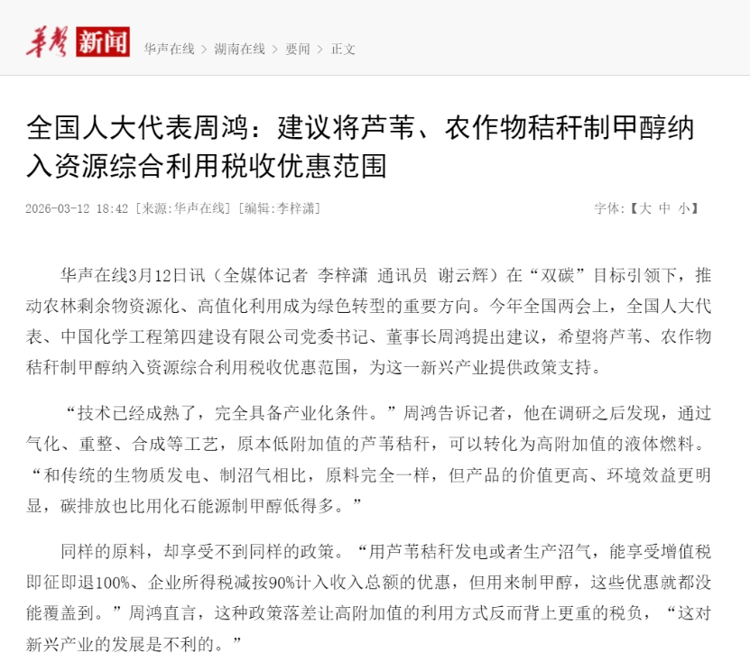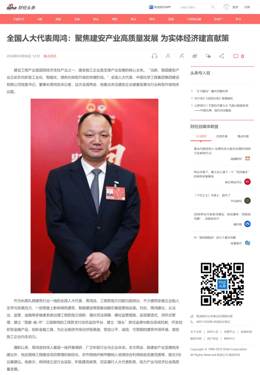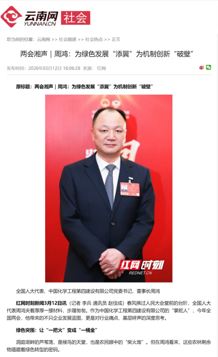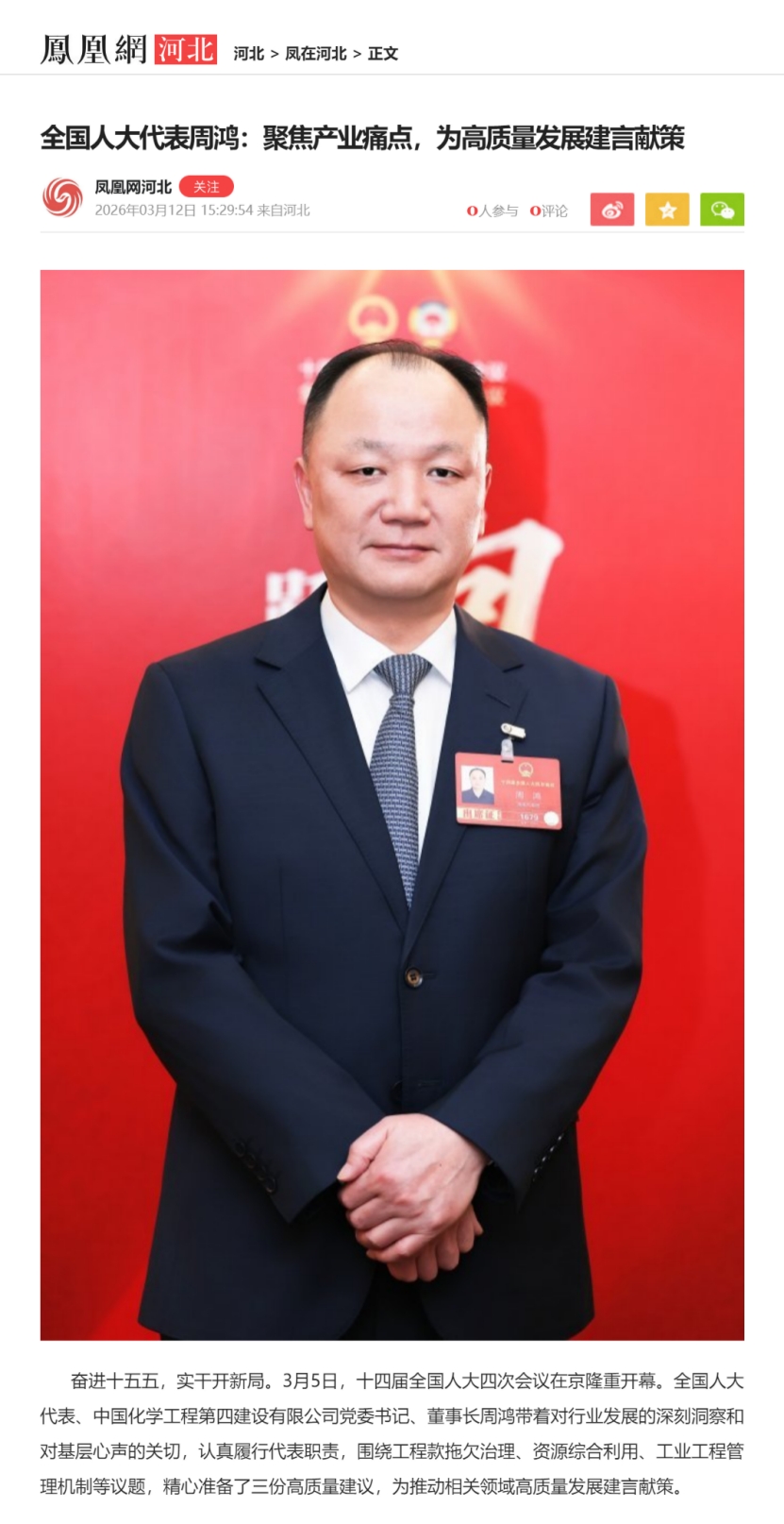 春風送暖,萬象更新。2026年全國兩會勝利閉幕,“十五五”開局的號角響徹神州大地。會議期間,全國人大代表,中國化學工程第四建設有限公司黨委書記、董事長周鴻認真履行憲法和法律賦予的神圣職責,積極建言獻策,圍繞工業領域工程建設項目管理機制優化、工程款拖欠頑疾治理、蘆葦秸稈制甲醇納入稅收優惠等熱點難點問題,提交了3份沉甸甸的建議。