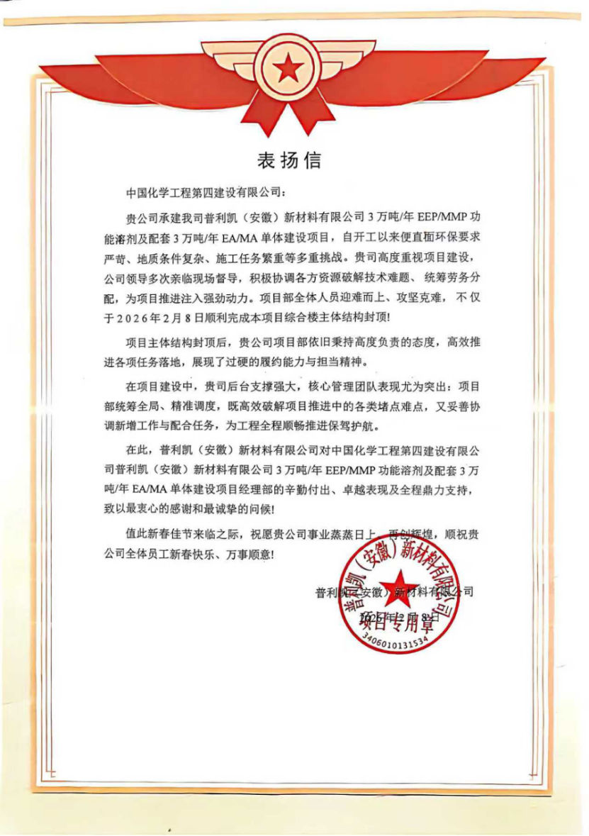 近日,由西部公司承建的普利凱(安徽)新材料有限公司3萬噸/年EEP/MMP功能溶劑及配套3萬噸/年EA/MA單體建設(shè)項目綜合樓主體結(jié)構(gòu)順利封頂,標志著項目建設(shè)取得階段性勝利,正式轉(zhuǎn)入二次結(jié)構(gòu)及裝飾裝修施工階段。業(yè)主單位特發(fā)來表揚信,對項目團隊的卓越表現(xiàn)給予高度評價。